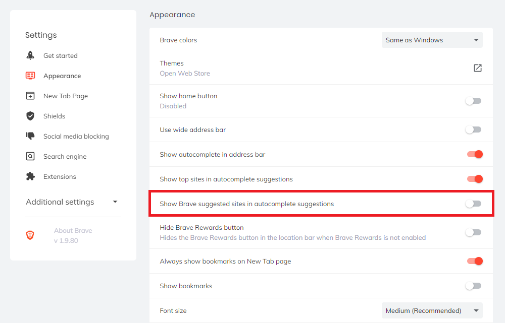 [Settings] → [Appearance] → [Show Brave suggested sites in autocomplete suggestions]를 비활성화하는 순으로 설정을 해주시면 됩니다.