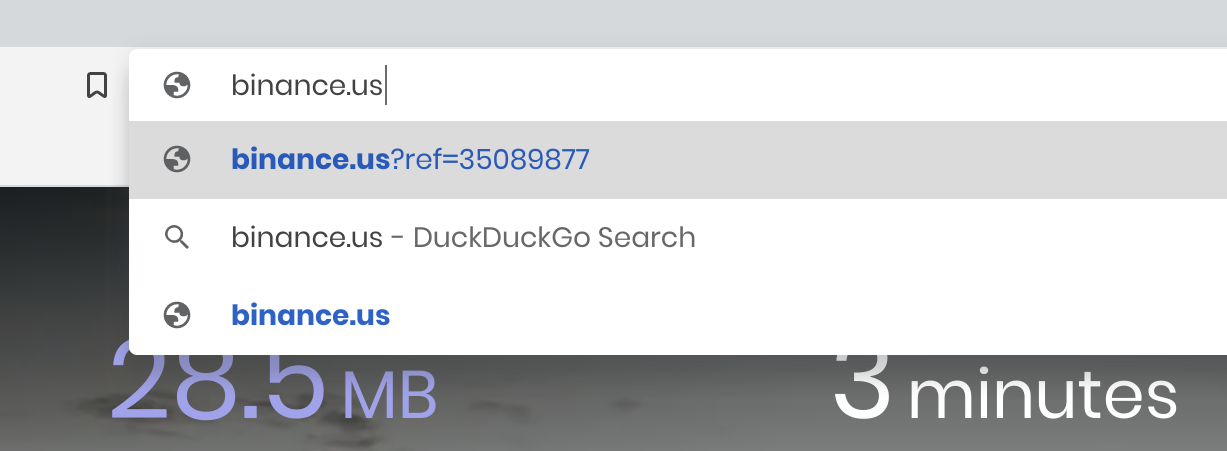 현재는 브레이브 브라우저의 버전 업데이트가 되면서 해당 문제가 해결된 상황이지만, 어제까지 업데이트 전 버전에서는 주소 입력창에 binance.us를 입력 후 엔터를 치는 경우 Brave의 레퍼럴코드가 연결된 주소로 접속되도록 설정이 되어 있었습니다.
