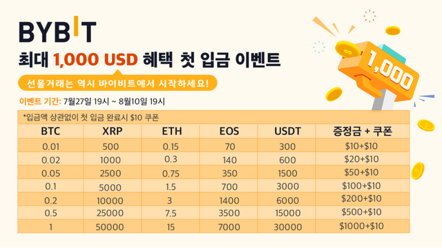 | [BYBIT] 입금만 해도 최대 1000달러를 받을 수 있는 입금 이벤트 진행 (4) | 2021.07.30 |