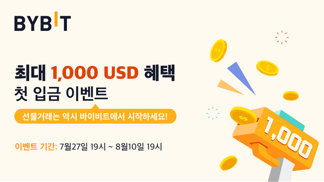 안녕하세요, 디온입니다. 암호화폐 선물거래소로 잘 알려진 바이비트(BYBIT)에서 신규 가입자들을 대상으로 암호화폐 입금만 해도 최대 1,000달러 + 10달러를 지원해주는 입금 이벤트를 진행 중에 있습니다.