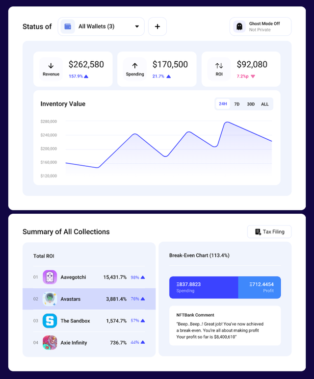 혹시라도 더 샌드박스나 크립토펑크, 엑시 인피니티 등 NFT 자산을 보유 중이시라면, NFT뱅크에 지갑을 연결하여 체험을 해보시는 것을 추천합니다. 실제 취득가, 현재 추정가를 비롯하여 액티비티 로그, 주요 NFT 프로젝트 등을 간편하게 확인해보실 수 있습니다.