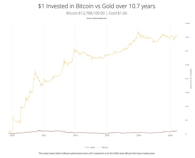 그렇다면, 약 10년 전쯤에 비트코인과 금에 각각 1달러씩을 투자했을 때 현재의 가치는 어떻게 바뀌었을까요?