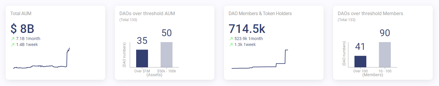 DeepDAO의 데이터에 따르면 현재 암호화폐(디지털 자산) 섹터에는 71만 명 이상의 DAO 멤버들이 있는 것으로 나타나며, DAO의 거버넌스를 통해 관리되고 있는 자산은 80억 달러를 초과하는 수준인 것으로 나타나고 있습니다.