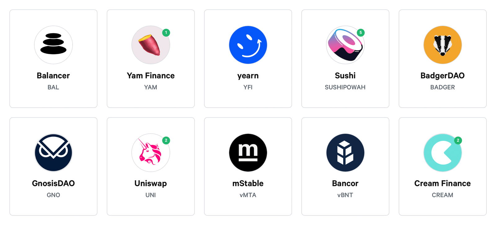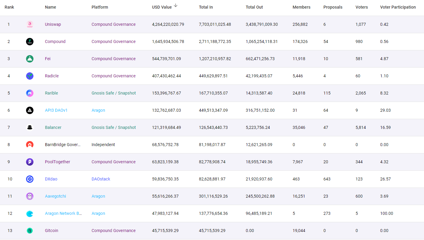 이 엄청난 자산의 대부분은 유니스왑(Uniswap), 컴파운드(Compound), 페이 프로토콜(Fei) 등 상위 20개 디지털 자산 프로젝트에 집중되어 있지만, Bankless와 같은 미디어 조직, Alex Masmej와 같은 소셜 토큰 커뮤니티, Gitcoin과 같은 개발 자금 조달 프로젝트에 이르기까지 DAO를 기반으로 하는 활용사례는 다양하게 나타나고 있습니다.
