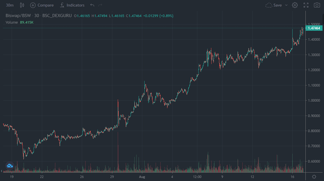 이에 따라 Biswap을 소개 드린 이후 Biswap의 프로토콜 토큰인 BSW의 가격도 지속적으로 꾸준히 우상향하고 있는 모습을 보여주고 있네요. 혹시라도 Biswap에 대해서 자세한 내용이 궁금하신 분들은 제 이전 포스팅을 참고해주시기 바랍니다.