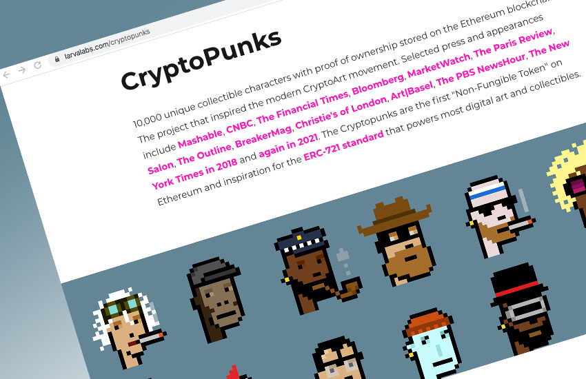 이더리움의 ERC-721 기반으로 만들어진 디지털 아트 NFT인 크립토펑크는 10,000개의 캐릭터가 저마다 다른 생김새를 가지고 있고 완전히 동일한 디자인은 없으며, 이더리움 지갑이 있는 사용자라면 누구나 자신의 지갑에 고유한 대체불가토큰으로 소유할 수 있습니다.