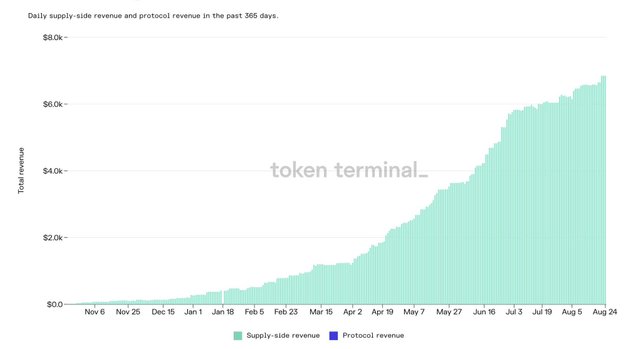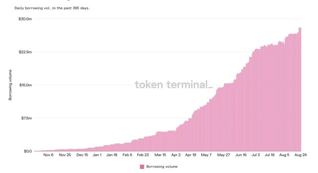 아래는 최근 데이터들을 살펴보다가 KuCoin에서 과감하게 투자를 한 프로젝트의 프로토콜의 revenue 및 borrowing volume 데이터입니다.