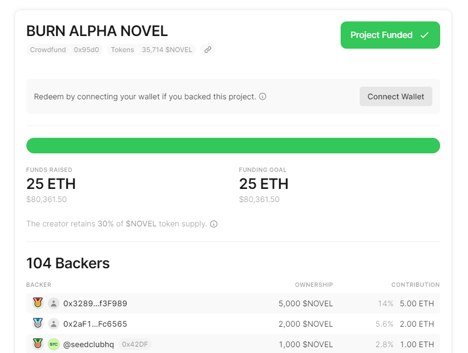 💡 Emily Segal이라는 작가는 자신의 차기 소설 "번 알파"를 가지고 미러에서 크라우드 펀딩을 진행하였으며, 독자들로부터 25 ETH (당시 기준으로 약 64,000달러)를 모금하였습니다. 참여자들은 모두 초판 NFT에 대한 부분 소유권으로서 NOVEL토큰을 가지게 되었죠.
