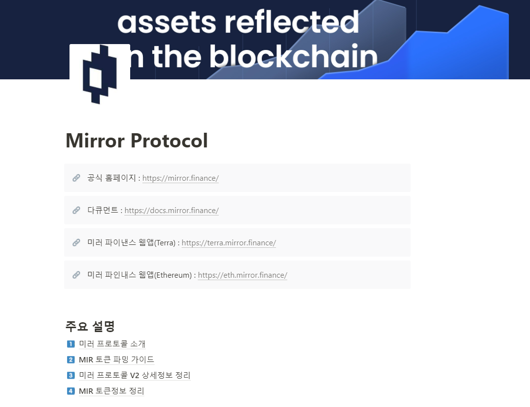예를 들면 미러 프로토콜을 클릭하면 홈페이지, 다큐먼트, 웹앱부터 시작해서 주요 사용법이나 설명, 토큰 정보 등을 한 눈에 확인할 수 있게 됩니다. 자세한 포스팅 내용은 각 카테고리를 클릭하면 더 자세히 볼 수 있구요.