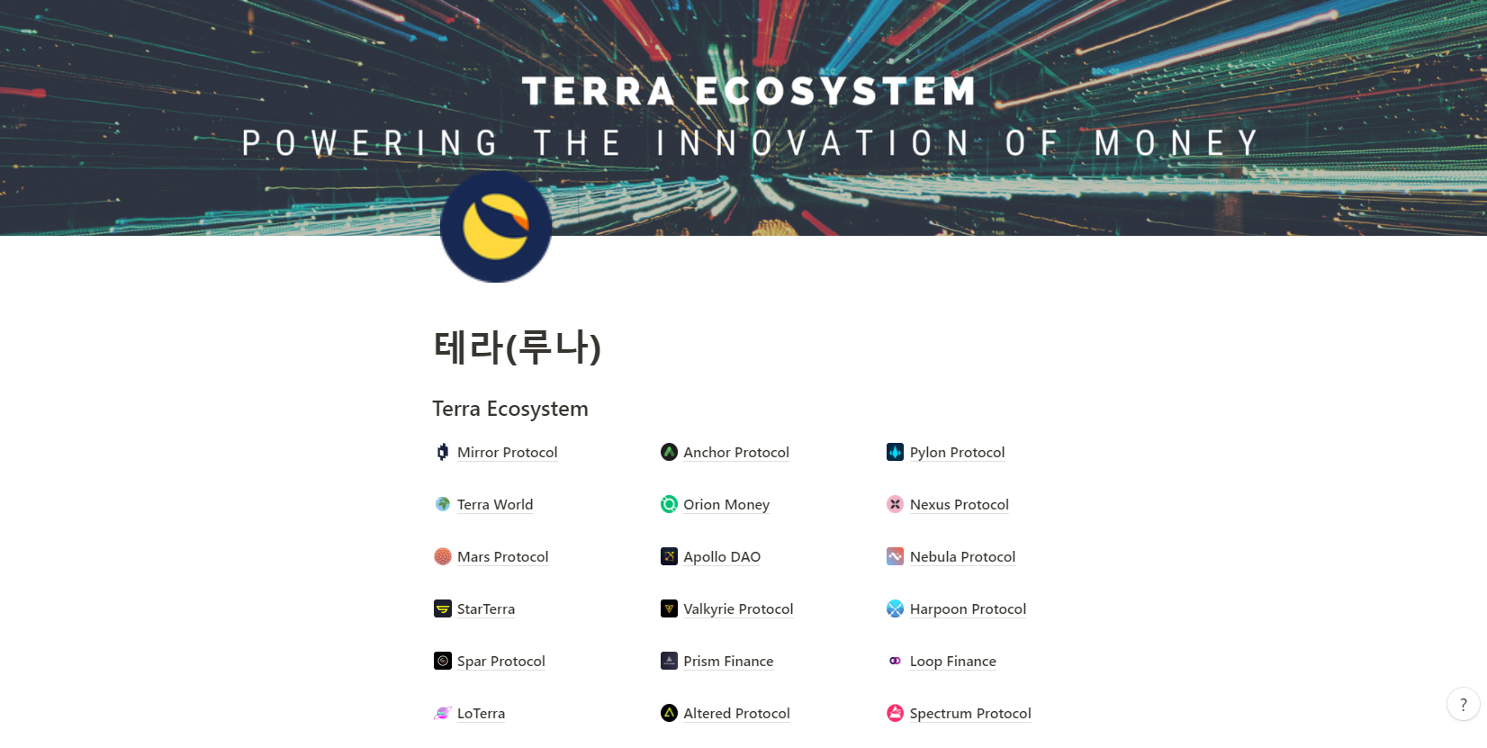 예를 들어, 테라(루나)의 생태계가 궁금한 경우 아래와 같이 어떤 프로젝트들이 있는지를 한 눈에 확인할 수 있고, 해당 프로젝트를 클릭해서 들어가면 해당 프로젝트에 대한 정보들을 나름의 순서대로 하나씩 궁금한 것을 해결해나갈 수 있습니다.