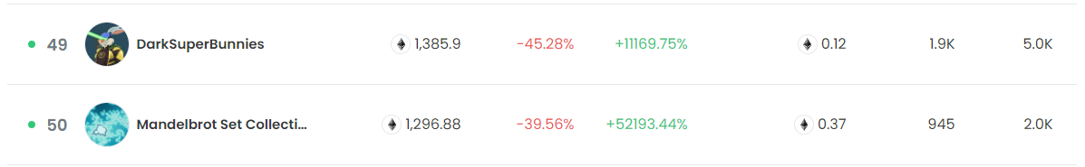가장 큰 이유는 NFT의 가격이 하루에도 10배, 100배씩 올라갈 수 있기 때문입니다. OpenSea나 Solanart 등에서의 거래 기록들을 살펴보면 하루만에 300% 이상, 일주일만에 25,000% 이상을 기록하는 NFT들을 쉽게 발견할 수 있죠.