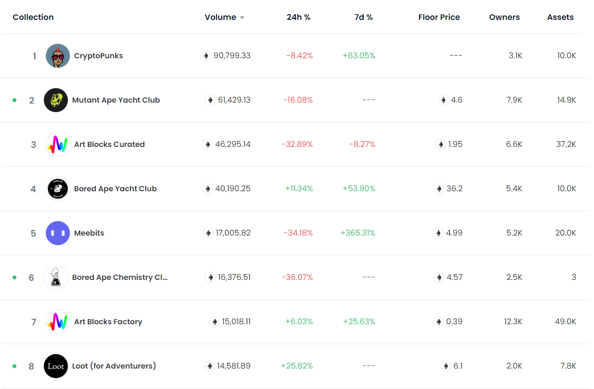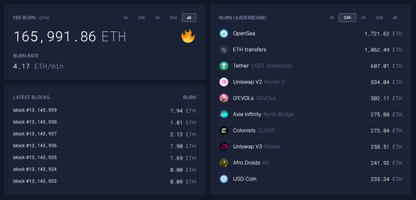 이더리움의 대체불가토큰(NFT)의 대표 마켓플레이스인 오픈씨(Opensea)는 현재 대량의 ETH를 소각하는 일등공신으로 활약하고 있으며, 지난 8월 한 달 동안의 오픈씨에서의 거래량은 무려 30억 달러에 육박하는 대기록을 달성하였습니다.