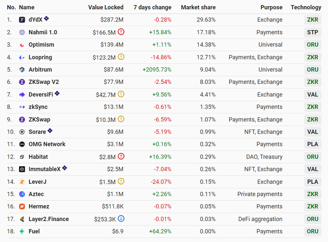 이더리움 레이어2 확장 솔루션의 종류나 형태는 다양하지만, 현재 커뮤니티의 반응을 살펴보면 옵티미즘(Optimism)과 아비트럼(Arbitrum)이 레이어2 확장 솔루션의 대표 선두주자로 자리매김하고 있는 분위기 입니다. 유니스왑, 발란서, 스시스왑 뱅코르 등 디파이 생태계 대표주자들이 옵티미즘과 아비트럼 네트워크를 지원하기 시작하고 있으며, TVL 역시 굉장히 빠르게 상승 중에 있습니다.