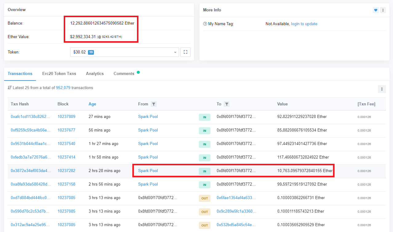 현재 SparkPool에서는 해당 수수료를 동결처리 한 뒤에 분실자 협상을 기다리는 중이라고 밝혔으며, 해당 사고 이 후에도 약 46,000개의 ETH를 보유하고 있는 계정의 소유주가 누군지, 어쩌다가 이런 일이 발생하게 됐는지에 대한 많은 이들이 관심이 몰려 있는 상황입니다.