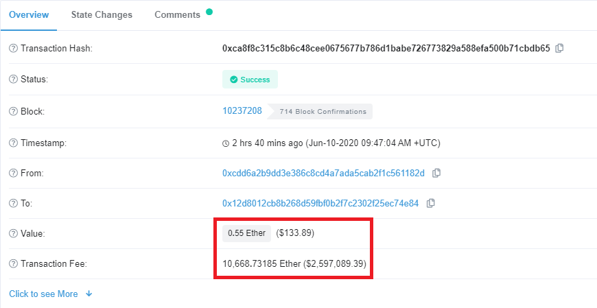 어제 밤에 이더리움 네트워크 상에서 0.55 ETH를 전송하면서 약 260만 달러의 전송 수수료(GAS)를 지불하는 대형 사고가 발생했습니다. 해당 트랜잭션은 전송 수수료로 무려 10,668 ETH를 지불하였으며 이는 원화로 환산했을 때 약 31억 정도에 해당하는 금액입니다.