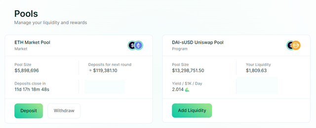 현재 sUSD/DAI는 9월 13일부터, ETH풀은 9월 17일부터 유동성 마이닝이 시작되었으며 각각 9월 27일 및 10월 1일에 종료가 됩니다.