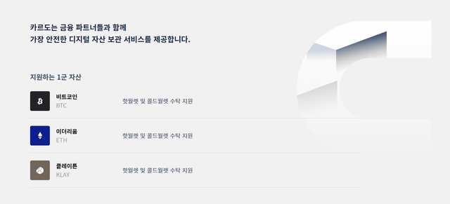 카르도에서 커스터디 서비스를 지원하는 1군 디지털 자산으로는 비트코인(BTC), 이더리움(ETH), 클레이튼(KLAY) 3가지이며, 다른 예시 이미지들을 살펴봤을 때는 상위 시총을 차지하는 디지털자산들을 천천히 추가해나갈 것으로 예상이 됩니다.