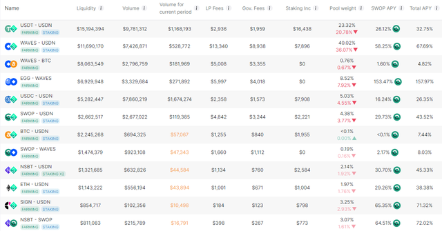 웨이브 생태계의 주요 토큰인 WAVES, USDN, NSBT, EGG, SWOP 등의 토큰들의 유동성 풀을 보유하고 있으며 런칭 이후 SWOP 토큰의 가격이 20달러를 돌파하며 큰 인기를 보였으나, 채굴 이외에는 마땅한 활용처가 부족했던 관계로 암호화폐 시장이 하락세로 돌아섰던 지난 4월부터는 계속해서 가격이 하락해왔습니다.