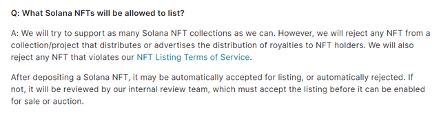 FTX에서는 가능한 다양한 솔라나 NFT 컬렉션을 지원할 예정이나 NFT 보유자들에게 로열티 수익을 배분하는 컬렉션과 프로젝트는 제외된다는 부분이다.