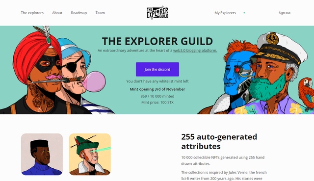 현재 화이트리스트들을 대상으로 1개당 100 STX로 프리민팅이 진행 중인 익스플로러 길드는 내일 밤부터 모든 사용자들을 대상으로 오픈을 할 예정이므로 시간에 맞춰 잘 대기하셨다가 민팅에 참여해보시는 것이 좋을 것 같습니다.