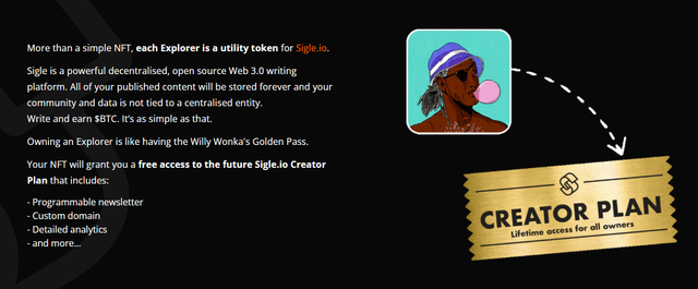 The Explorer Guild의 NFT를 발행(구매)하는 것은 스택스 기반 탈중앙화 블로깅 플랫폼인 Sigle의 초기 펀드레이징에 참여하게 되는 것으로 단순한 NFT 이상의 가치를 가지게 될 것으로 예상이 됩니다.