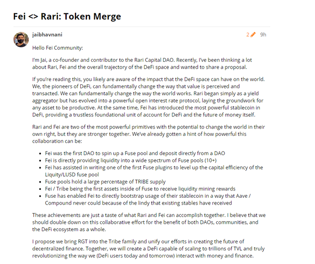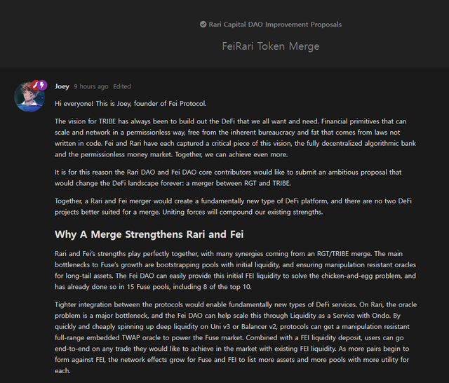 해당 제안서를 작성한 사람은 Fei Protocol의 파운더인 조이 산토로와 Rari Capital의 코파운더인 자이 바브나니로 만일 해당 제안에 대해 양측의 토큰 홀더들의 투표 결과 찬성으로 결론이 나는 경우 디파이 역사상 가장 흥미로운 DAO와 DAO의 합병이 성사되게 됩니다.