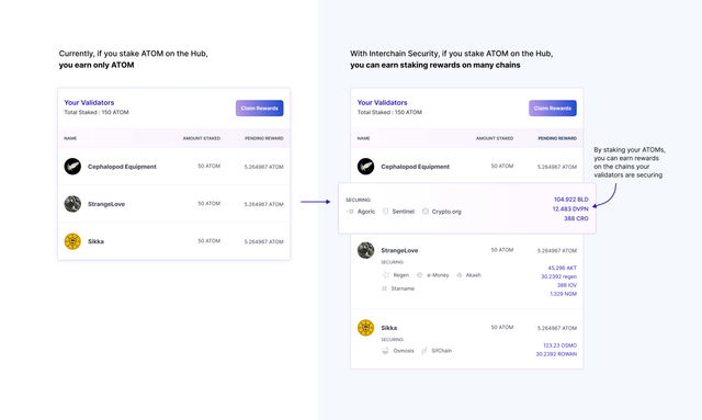- 인터체인 파운데이션과 인포멀 시스템즈에서 개발 중인 Interchain Security는 밸리데이터와 위임자들이 허브에 ATOM을 스테이킹함으로써 여러 체인의 보상을 받을 수 있게 할 것입니다