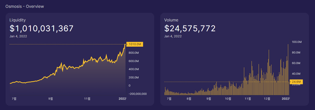 - 일전에 [Cosmos] 코스모스 Interchain AMM 오스모시스(Osmosis) 정보포스팅을 통해 소개드렸던 오스모시스는 1 Billion 달러라는 엄청난 유동성을 확보하며 코스모스 생태계의 대표 AMM으로 성장했습니다