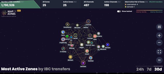 - 2021년 4월 코스모스 허브와 아이리스넷의 첫 거래를 시작한 이후 최근 30일 동안 300만 건 상당의 IBC 트랜잭션이 이뤄지고 있는 것을 확인할 수 있습니다