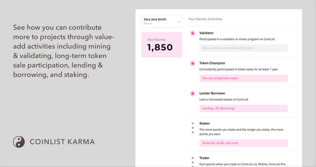 - 코인리스트 Karma는 코인리스트에서 스테이킹, 대출, 거래, EGL Genesis 등 다양한 활동에 참여할 때마다 보상으로 받을 수 있는 포인트입니다