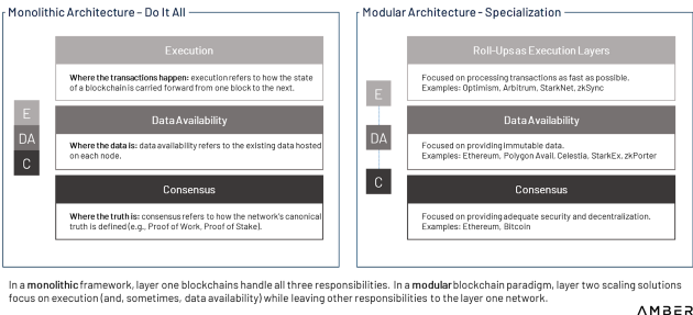 [역자 주] 모놀리식 프레임워크에서 레이어1 블록체인(예: 이더리움 메인넷)은 실행(Execution), 데이터 유효성(Data Availability), 합의(Consensus)를 모두 핸들링할 책임을 가지지만, 모듈형 블록체인 패러다임에서 레이어2 확장 솔루션은 나머지에 대한 모든 책임은 레이어1에 맡기고나머지에 대한 모든 책임은 레이어1에 맡기고나머지에 대한 모든 책임은 레이어1에 맡기고 실행(Execution)에만 초점을 맞추게 됩니다.