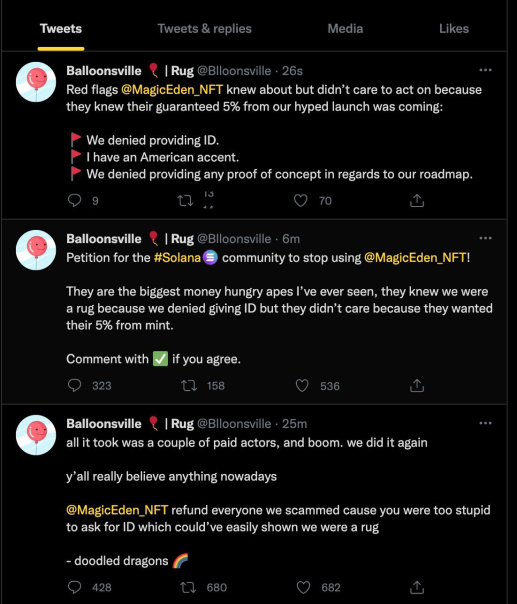 - Balloonsville이라는 신규 NFT 프로젝트가 매직에덴의 런치패드로 런칭이 되었고, 민팅 이벤트가 끝나자마자 사고가 터졌습니다