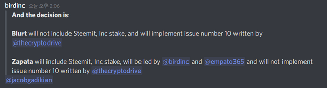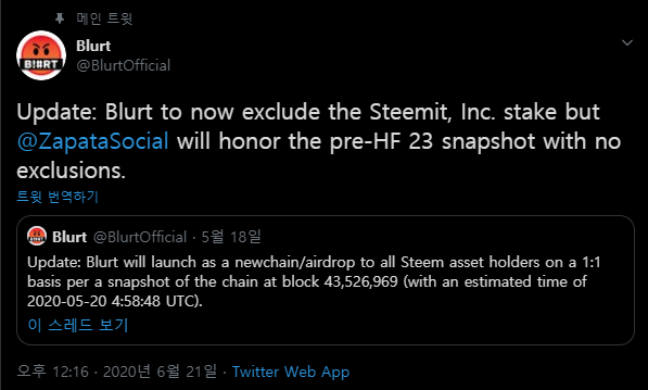 당초 7월 4일에 새로운 스팀 포크체인으로 런칭이 예정되어 있던 Blurt에도 이를 런칭하는 그룹 간의 의견차이가 발생하면서 Blurt와 Zapata라는 2개의 체인이 동시에 런칭할 예정이라고 합니다.