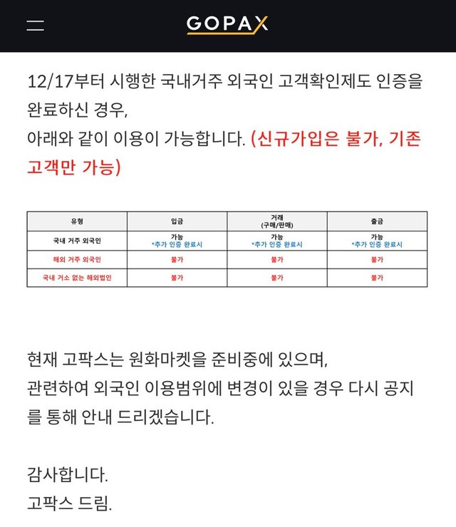 지난 12월 27일에도 고팍스에서는 공지를 통해 원화마켓을 준비 중에 있다고 알리며 어느 정도 긍정적으로 협의가 진행되고 있음을 암시한 바 있습니다.