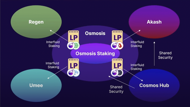 위에서 언급했던 것처럼 Superfluid 스테이킹은 현재 오스모시스의 OSMO/ATOM LP 공급자만 이용이 가능하며 OSMO토큰만 해당이 되는데, 오스모시스 팀에서는 유동성을 다른 체인에서도 스테이킹할 수 있게 하는 Interfluid Staking에 대한 로드맵을 가지고 있습니다.
