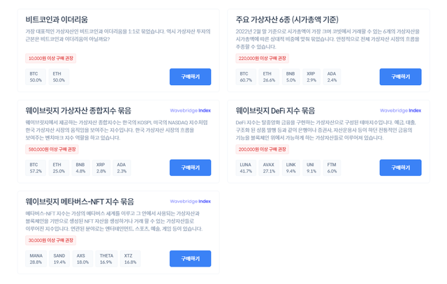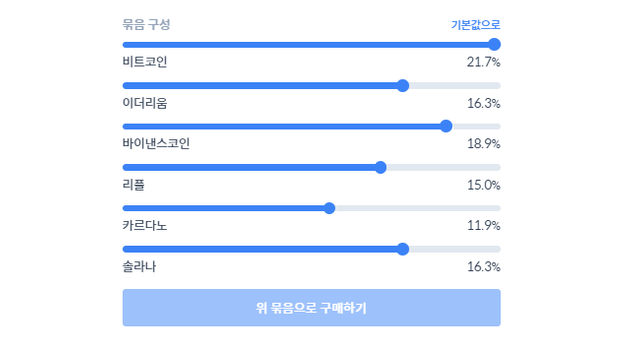 - 묶음 구매는 코빗 리서치센터에서 제안하는 구성의 여러가지 종류의 가상자산들을 일괄 구매하는 기능입니다
