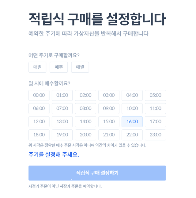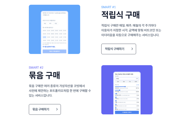 - 적립식 구매 : 일, 주, 월 주기로 일정한 시간에 사전에 지정한 금액만큼의 비트코인 또는 이더리움을 구매해주는 기능