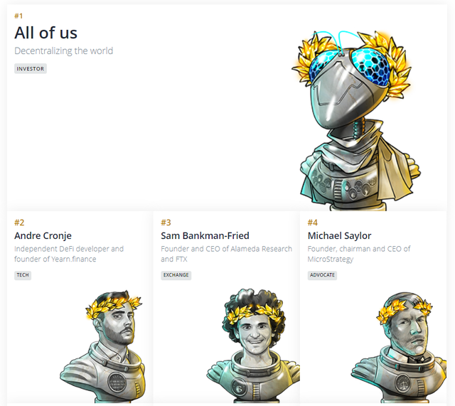 - 코인텔레그래프의 TOP 100에서의 1위는 모든 디파이 사용자들이었기 때문에 FTX의 CEO인 SBF보다 높은 순위를 차지했던 Andre Cronje가 사실상 1위였다고 할 수 있습니다
