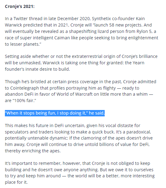 - 코인텔레그래프에서 선정한 2021년 블록체인 씬에서 가장 주목할만한 인물 TOP 100에서 TOP 2에 랭크되며 많은 관심을 받아왔던 스타 개발자 Andre Cronje가 DeFi 및 크립토 스페이스에서의 모든 활동을 종료한다는 소식이 발표되었습니다
