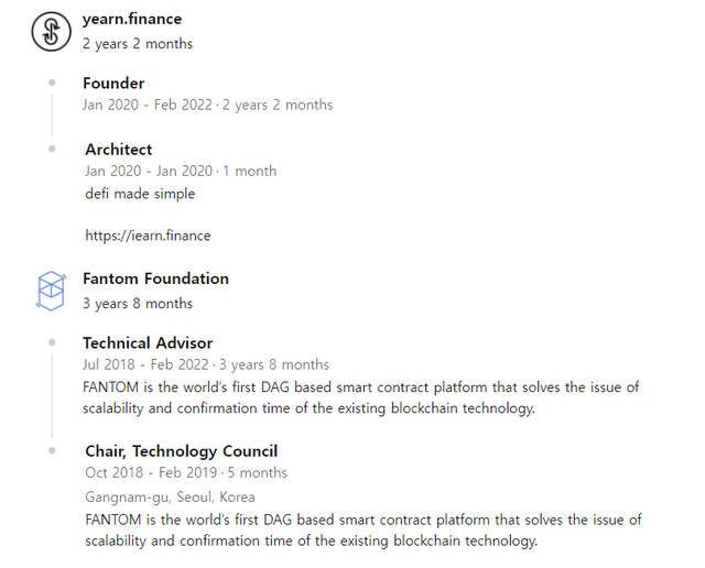 - 급작스러운 트위터 탈퇴 후 며칠 전부터 안드레의 링크드인 프로필이 Yearn 파이낸스 및 팬텀 재단의 테크니컬 어드바이저 직을 내려놓았음을 암시하는 내용으로 수정되며, 많은 사람들이 "안드레도 빤스런한 것이 아니냐"는 의심을 하고는 있었죠
