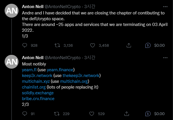 - 아직까지도 안드레가 공식적으로 발표를 한 것은 아니지만 팬텀 재단의 시니어 솔루션 아키텍처인 Anton Nell이 자신의 트위터를 통해 안드레와 나는 디파이 및 크립토 관련 모든 활동을 접는다고 발표하였고, 안드레가 개발해왔던 주요 서비스들의 터미네이팅 모드로 전환되었습니다