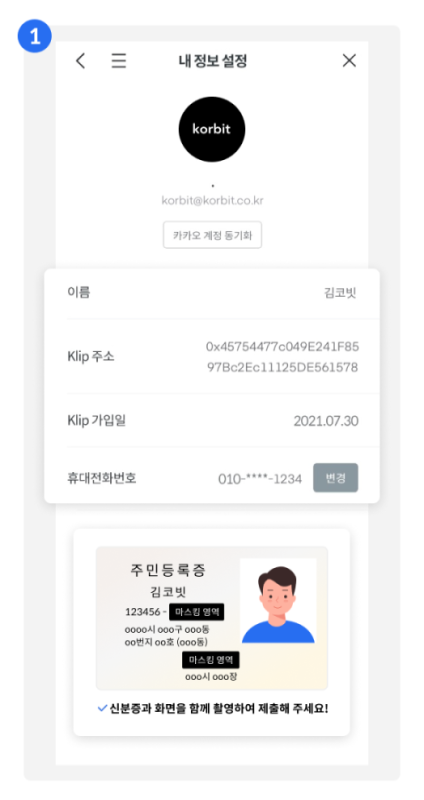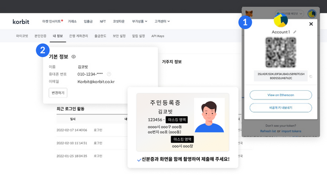 - 한 화면에서 코빗 사이트 내 가입정보, 개인지갑의 지갑주소를 띄운 상태에서 가운데에 신분증 실물을 두고 촬영을 한 경우에 등록이 가능합니다