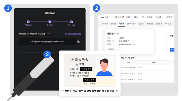 - 하드월렛 사용자의 경우 한 화면에서 개인지갑의 지갑주소, 코빗 사이트내 가입정보를 띄운 상태에서 가운데에 신분증 실물과 실물지갑을 같이 두고 촬영하여 등록이 가능합니다