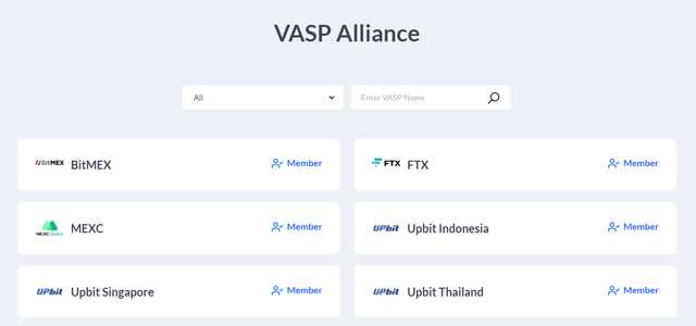 베라파이바스프 웹사이트에서는 얼라이언스 멤버로 정식 등록이 되었거나 현재 펜딩 중인 가상자산사업자 명단을 확인할 수 있습니다.