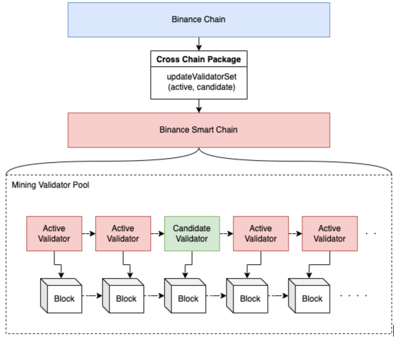 가장 많은 BNB를 스테이킹한 밸리데이터가 24시간 단위로 선출되어 BNB스마트체인의 네트워크를 운영하고 보호하는 역할을 수행하고 보상을 받게 됩니다.