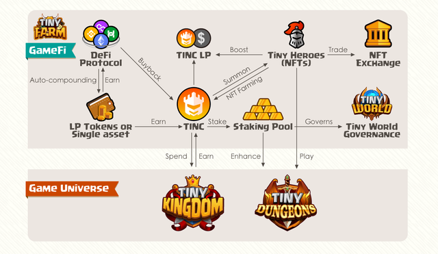 타이니월드의 TINC 토큰은 타이니월드 유니버스에서 사용되는 유틸리티 토큰이자 DAO의 거버넌스 토큰으로 활용되는데 게임 플레이를 통한 P2E, NFT의 소환, 유동성 공급을 통한 파밍 등에 직접적으로 관여가 됩니다.