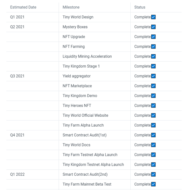 - 타이니월드의 경우에는 일드 애그리게이터(DeFi) → 자체 마켓플레이스(NFT) → 타이니킹덤(게임) 순으로 자신들이 로드맵에 밝혀 놓은 출시 일정을 지켜가며 빠르게 프로덕트를 딜리버리하고 있습니다