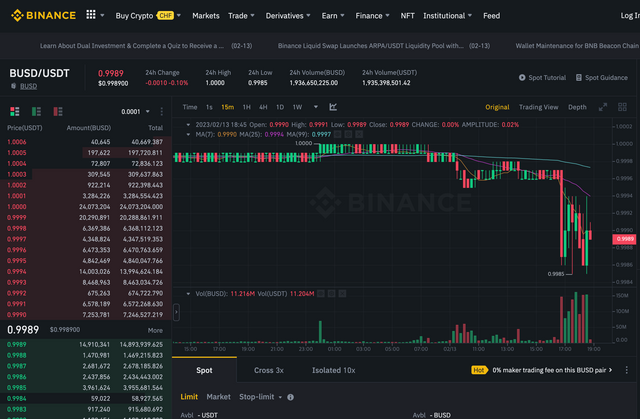 지난 해부터는 같은 스테이블코인이라고 하더라도 USDT, USDC, BUSD의 상대적 가격 변동폭이 꽤 크게 벌어지는 경우가 자주 나타나고 있습니다. 혹시라도 기존에 BUSD를 USDT로 미리 전환해 놓은 경우에는 BUSD/USDT의 페깅이 얼마나 심하게 깨지는지를 살펴보고 위와 같은 차익거래를 해 보시는 것도 나쁘지는 않을 것 같네요.