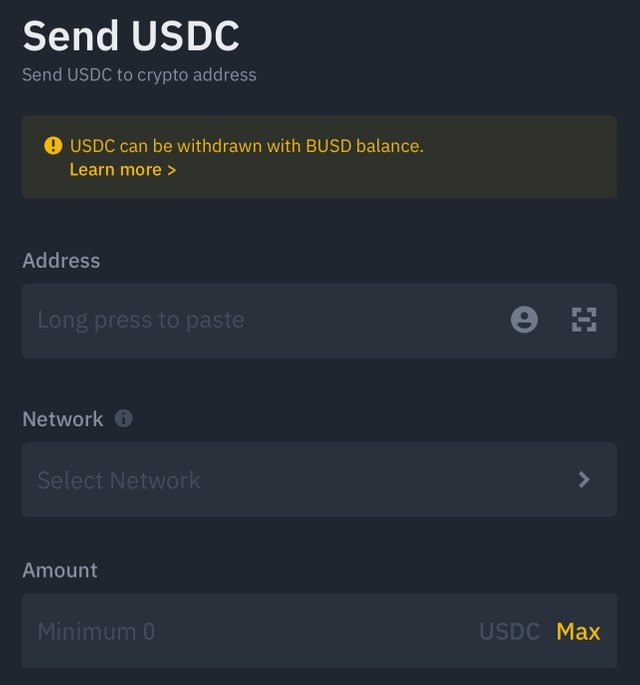 바이낸스 월렛에서 Withdraw로 들어가서 USDC를 검색하면 현재 보유 중인 BUSD를 동일한 수량의 USDC로 인출하는 것이 가능합니다.