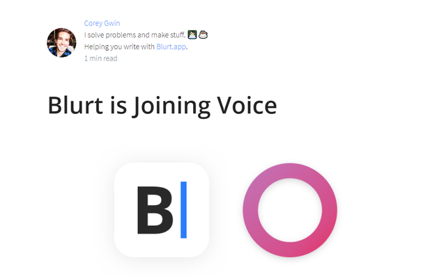 아이디어부터 퍼블리시에 이르기까지 단순히 글을 쓰는 것이 아니라 한 곳에서 원하는 모든 글쓰기 도구 기능을 제공하여 최고의 글쓰기를 돕는 플랫폼 BLURT의 개발을 리드해왔던 Corey Gwin이 VOICE에 합류한다는 소식입니다.